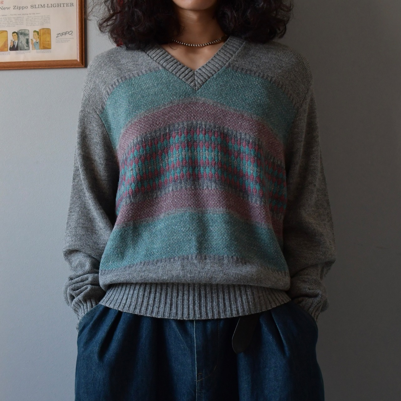 80s-90s V neck Design knit
